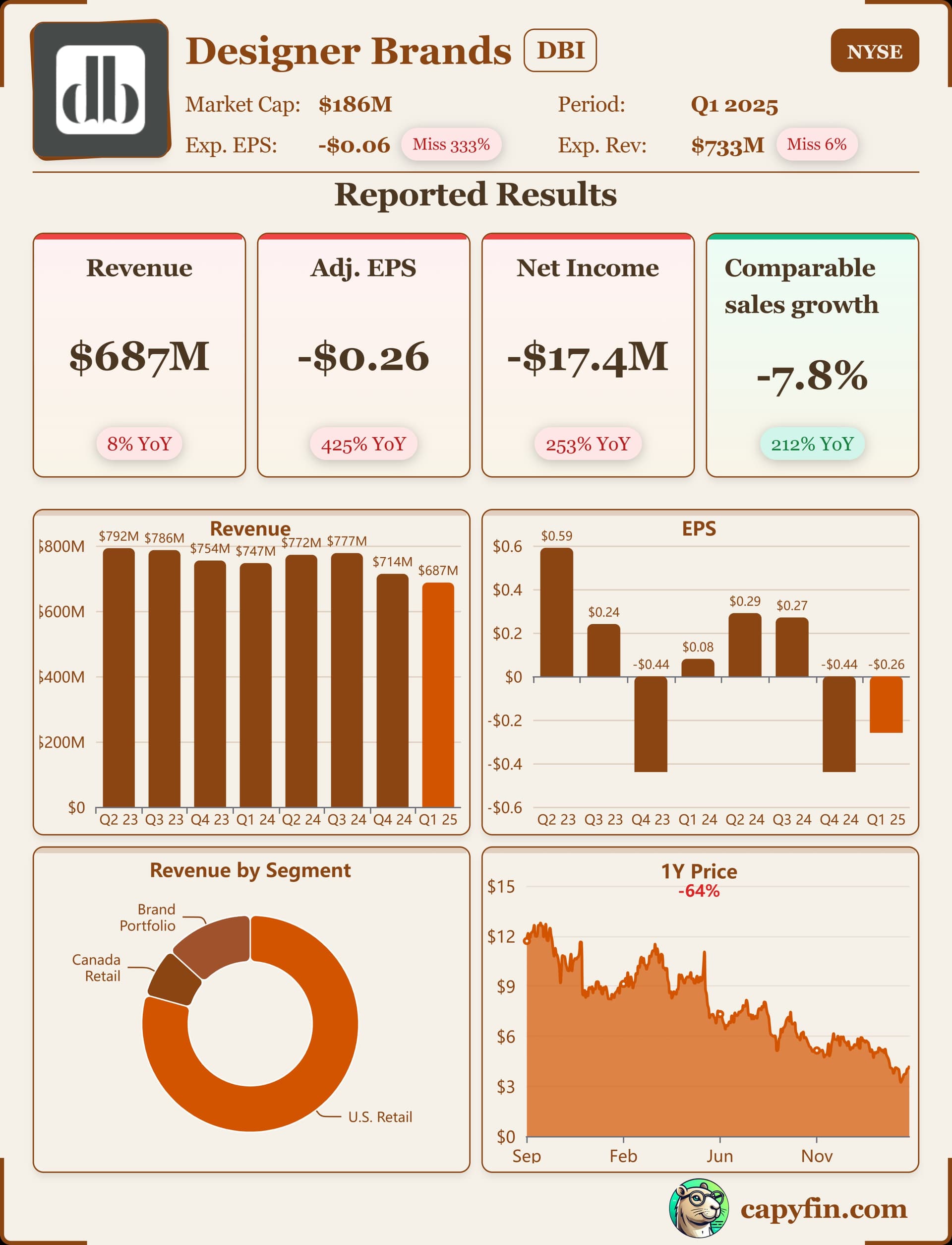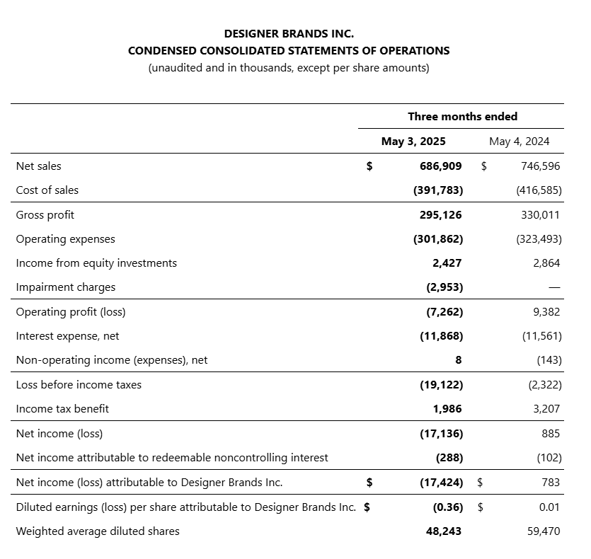 - Reported net income attributable to Designer Brands Inc. was $162.7 million, or diluted EPS of $2.26, including net benefits of $0.41 per diluted share from adjusted items, primarily related to the change in valuation allowance on deferred tax assets, partially offset by the loss on extinguishment of debt and write-off of debt issuance costs, restructuring and termination costs, CEO transition costs, and impairment charges.