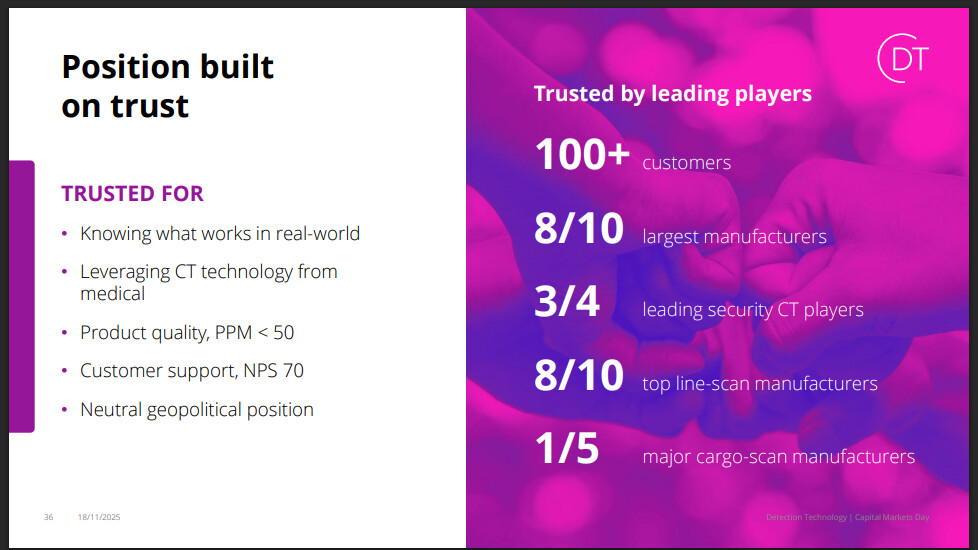 Our search function seems to be working poorly; I believe it has been mentioned much more often historically. But the assumption has been that Smiths is a significant customer of DT. There’s no factual basis for this, as it’s not a public reference. However, on CMD’s slides, DT stated that 3/4 of the major players in Security CT are the company’s customers, so the probabilities likely support this assumption.