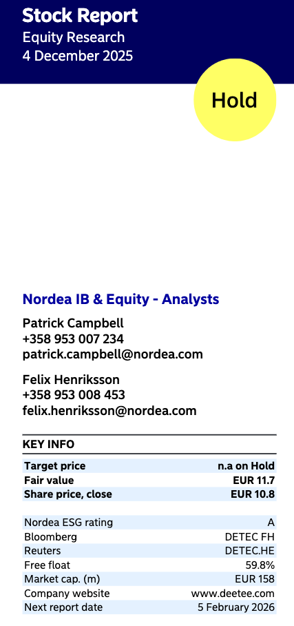Toistamme Detection Technologylle osta-suosituksen 13,5 euron tavoitehinnalla. Arviomme mukaan edessä oleva Q4’25-raportti on vielä heikko liikevaihdon ja kannattavuuden ollessa edelleen paineessa, joten vuosi 2025 jää DT:n historiaan tuskien taipaleena. Vuonna 2026 vastatuulen pitäisi kuitenkin hellittää, ja arvioimme Q1:lle jo ohjeistetun kaksinumeroisen kasvun laajenevan myös H1:lle. Samalla tulos paranee asteittain. Negatiivisista ennustemuutoksista huolimatta osakkeen arvostus on mielestämme erittäin houkutteleva, kun horisontissa näkyy jo valoa.