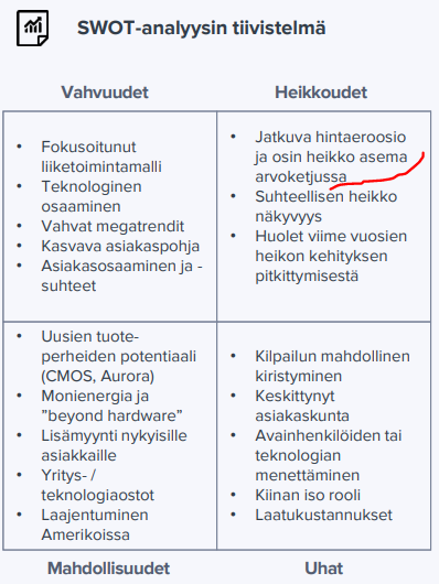 Tuota ei tosiaan tuossa kohdassa oikein avata, mutta yhdistyy tuohon hintaeroosioon ja sitoutuneeseen käyttöpääomaan. Eli DT:hän on korkean lisäarvon alihankkija (käsitelty ainakin s. 25), mutta alihankkija kuitenkin. Koko ajan pitää juosta kovempaa, että pysyy edes paikallaan. Eihän silloin voida oikein suuresta hinnoitteluvoimasta tai vahvasta positiosta arvoketjussa puhua, mutta toisaalta ollaan kuitenkin teknologisesti haastavissa osissa eikä siellä valtavaa kilpailupainetta ole (toimialan keskimääräinen kannattavuus hyvä). Tuo on sitten sellainen kompromissi: “osin heikko”