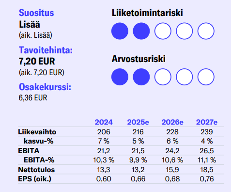 Joni raised his forecasts since no profit warning was issued and now expects an adjusted EPS of €0.66 for this year. The fair value range was simultaneously raised from €7.2–€8.8 → €7.8–€8.8. The changes were logical, but the target price was illogically left the same at €7.2 even though the aforementioned items were adjusted upwards ![]()