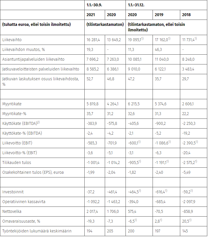 Lisäksi Yhtiön tavoite on selvästi positiivinen oikaistu käyttökate-%[2] vuoden 2026 loppuun mennessä. Pidemmällä aikavälillä Yhtiö tavoittelee yli 20 prosentin oikaistua käyttökate-%, mutta kaudella 2021–2026 Yhtiö priorisoi kasvuun investoimista kannattavuuden sijaan.