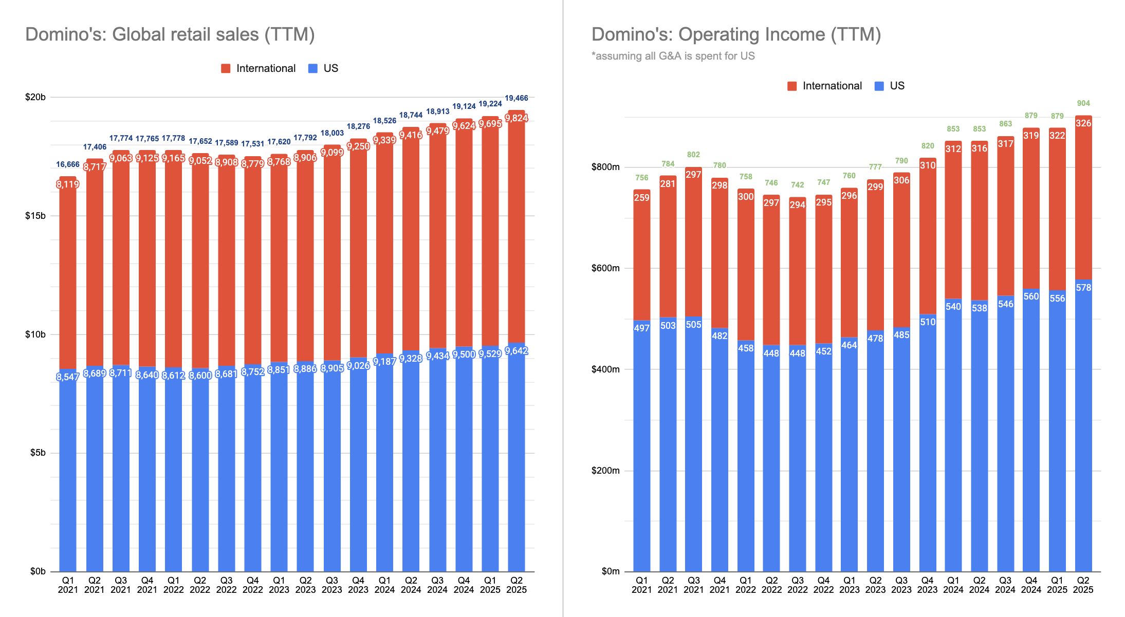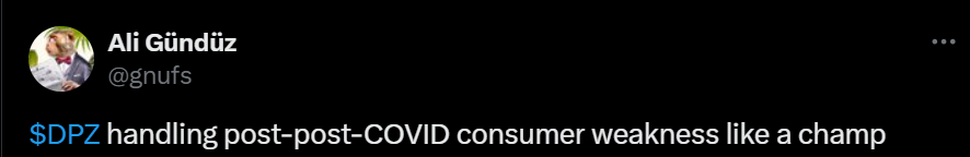 Tviitissä ollaan sitä mieltä, että Domino’s näyttää pärjäävän hienosti vaikeassa markkinassa sekä liikevaihto että käyttökatteet ovat kasvaneet tasaisesti, erityisesti Yhdysvalloissa, kuten edellisessäkin viestissä on todettu.