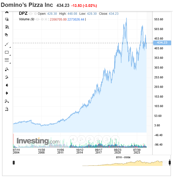 Vaikka Domino’s on vahvasti mukana pikaravintolabisneksessä ja kuluttajien odotetaan lisäävän kulutustaan, yhtiön tuloskehitys on ollut kaikesta huolimatta vain keskinkertaista verrattuna kilpailijoihin. Tulosennusteet viittaavat kuitenkin 20 prosentin kasvuun tulevina vuosina, mikä voisi nostaa osakkeen arvoa (toivotaan, toivotaan?". Silti, monista nykyinen hinta ei tarjoa houkuttelevaa ostopaikkaa… ja jotkut saattavat hakea sitä myyntipaikkaa.