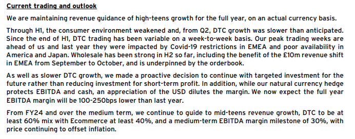 “Although there are economic challenges ahead, we are well positioned for future growth. We will continue to drive growth investment to deliver the DOCS strategy, mainly in new stores, marketing, people,technology and inventory. Reflecting our confidence in the future, our balanced global revenues and our strong balance sheet, the board has decided to increase the interim dividend by 28% to 1.56p per share.”