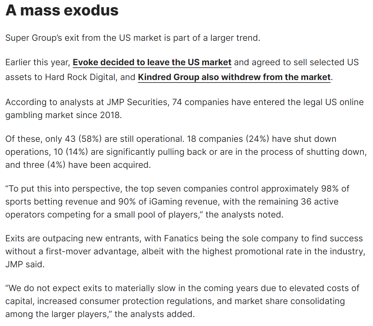 “Perspektiivin asettamiseksi seitsemän suurinta yritystä hallitsee noin 98 % urheiluvedonlyönnin tuloista ja 90 % iGaming-tuloista, kun taas loput 36 aktiivista toimijaa kilpailevat pienestä pelaajapoolista,” analyytikot totesivat.