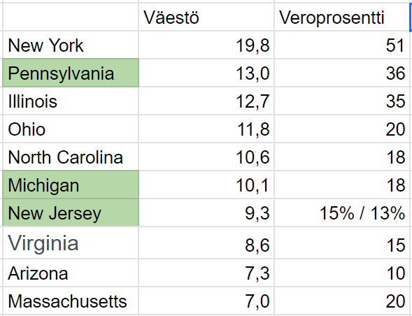 Alla suurimmat markkinat ja niiden veroprosentti.