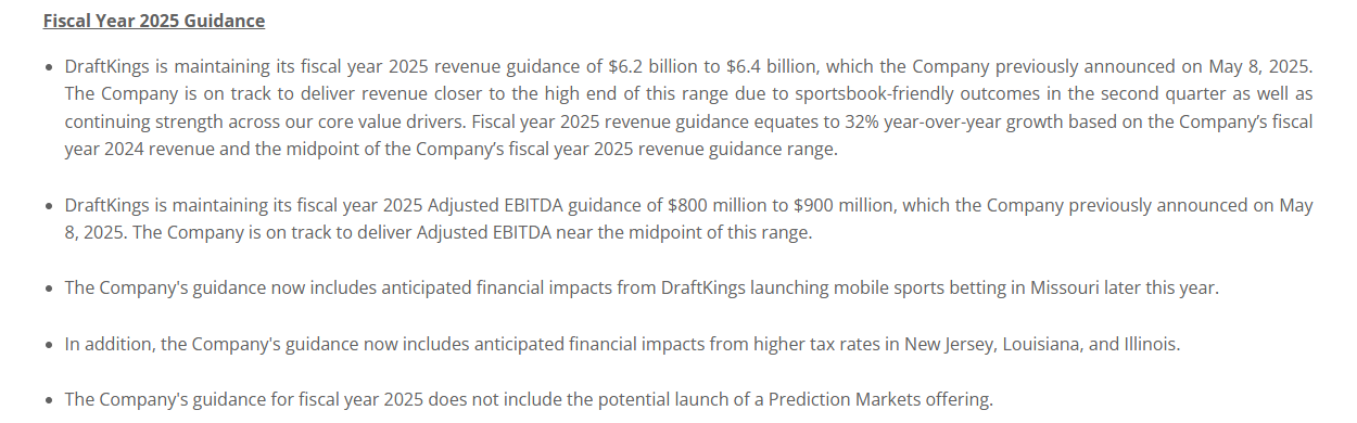 DraftKings is revising its fiscal year 2024 revenue guidance due to the impact of customer-friendly sport outcomes early in the fourth quarter of 2024 to a range of $4.85 billion to $4.95 billion from the range of $5.05 billion to $5.25 billion, which the Company previously announced on August 1, 2024. The Company’s updated 2024 revenue guidance range equates to year-over-year growth of 32% to 35%.