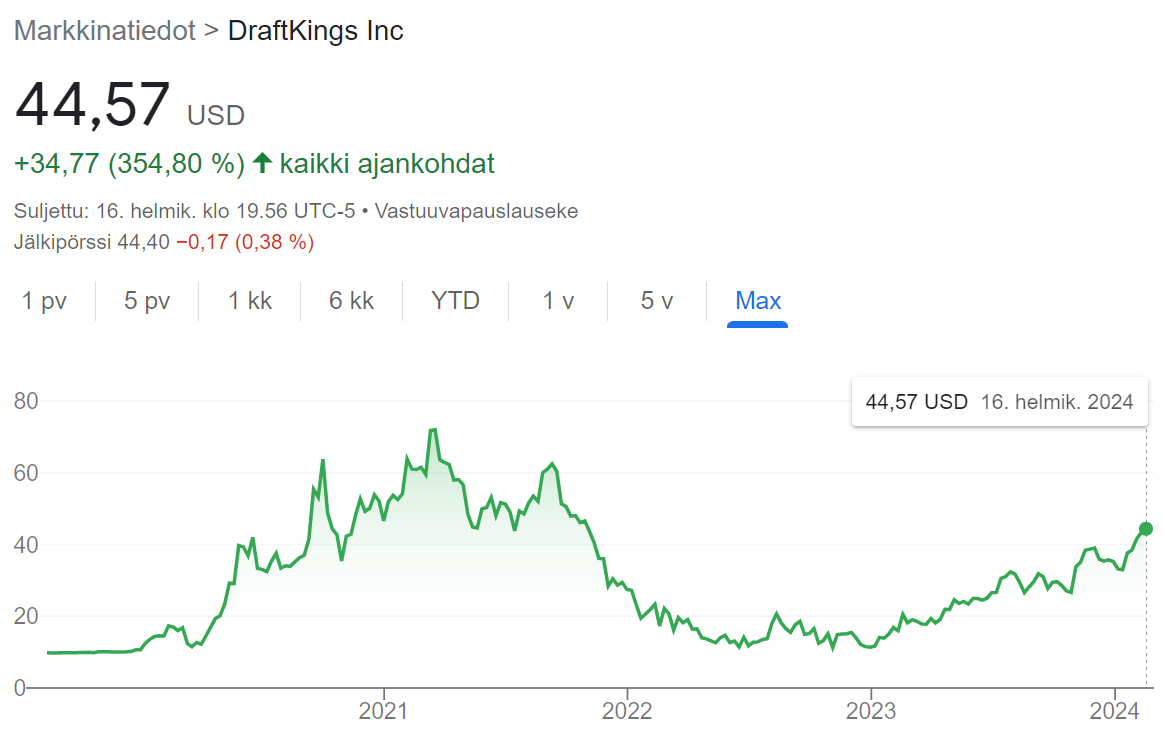 En omista itse DraftKingsia. Kilpailija Flutter on suurin sijoitukseni.