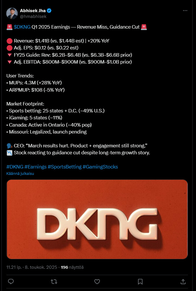 Tammikuu oli ennätyksellisen hyvä kuukausi, Helmikuu kehno ja Maaliskuu ok vedonlyöntimarkkinalla. Kilpailija Flutterin osari antaa tosiaan paremmat näkymät. Riskihän on että DK joutuisi alentamaan tavoitteitaan. DK operoi myös kahdessa osavaltiossa jossa Flutter ei (New hampshire ja Maine). Sekin heikentää omaan silmään tuota market sharea.