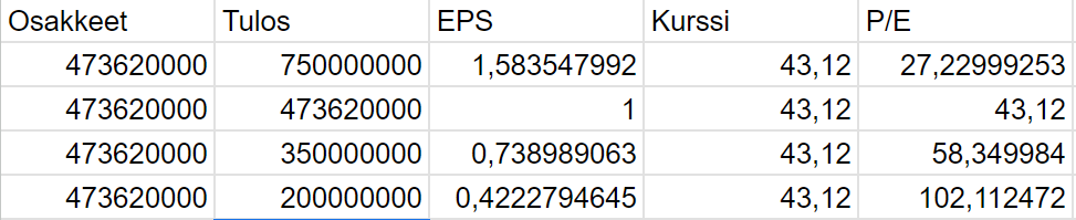 Olin tätäkin analysoinut. Jos yhtiö tekisi saman verran tulosta mitä on osakkeita, silloin EPS = 1 ja P/E 43. 750 miljoonan liikevoitolla pääsisi maltilliseen P/E 27 lukuun.