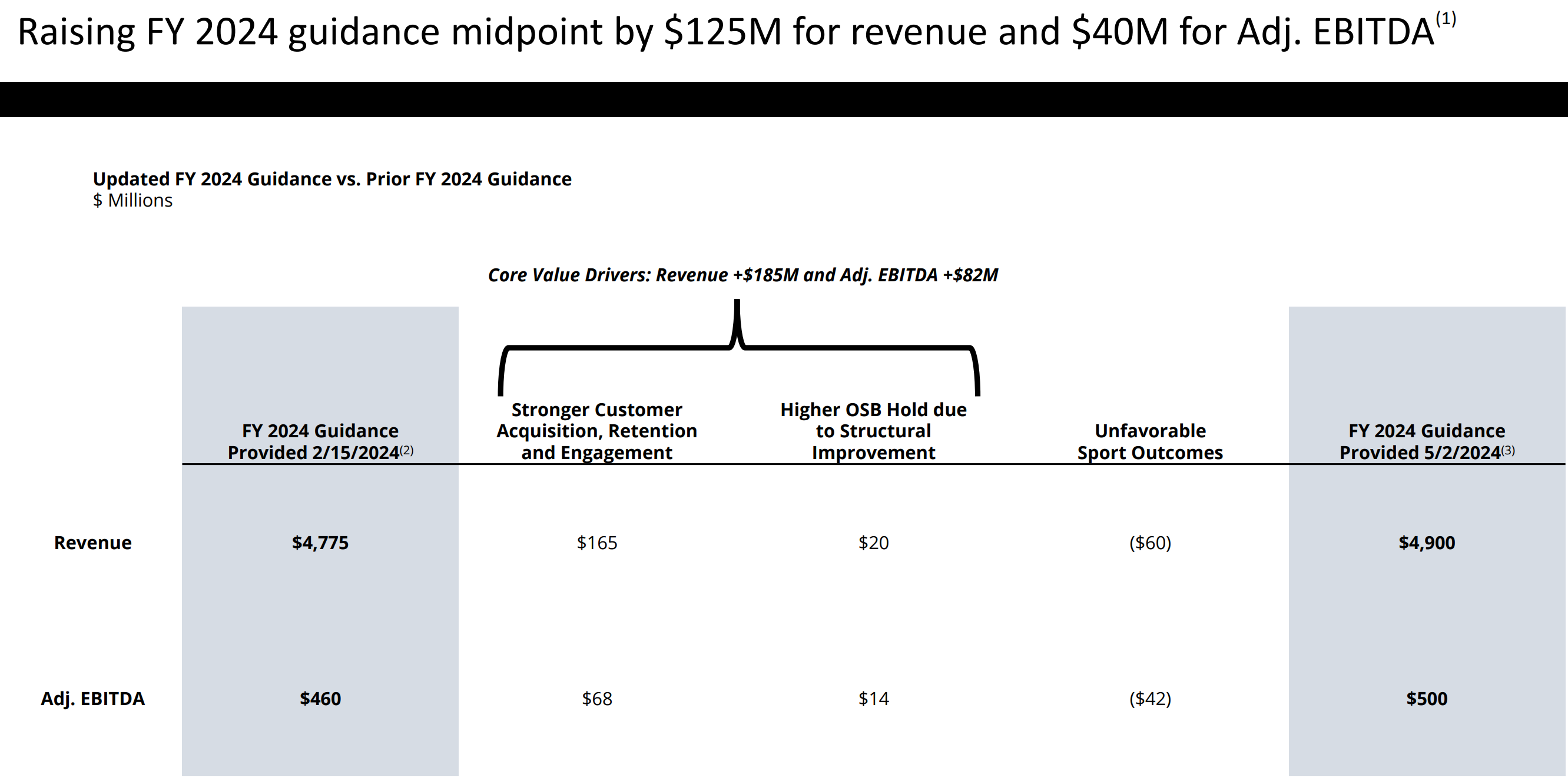 DraftKings is revising its fiscal year 2024 Adjusted EBITDA guidance due to the impact of customer-friendly sport outcomes early in the fourth quarter of 2024, partially offset by promotional optimization and expense efficiency. The Company now expects fiscal year 2024 Adjusted EBITDA of between $240 million and $280 million compared to its prior fiscal year 2024 Adjusted EBITDA guidance of between $340 million and $420 million, which the Company previously announced on August 1, 2024.