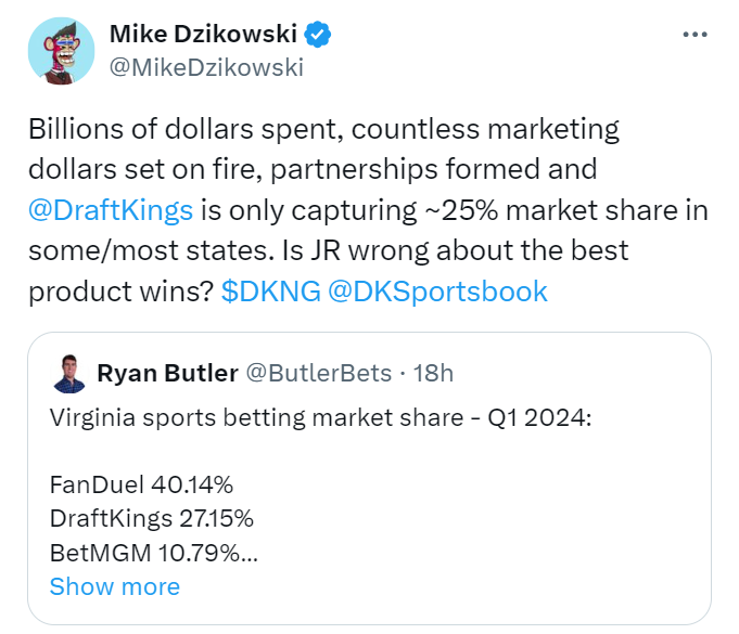 Kilpailija Flutterilla (FanDuel) on 30v kokemus alalta. Tuntevat vedonlyöntimarkkinan hyvin ja pystyvät tarjoamaan parempia kertoimia. Data-analytiikka on tärkeätä ja sitä varten tarvitsee suuret datamassat. Kyllä se näkyy operatiivisessa toiminnassa kun pyörittää lukuisia eri sivustoja vuosikymmeniä. DraftKings on lapsen kengissä tällä saralla.