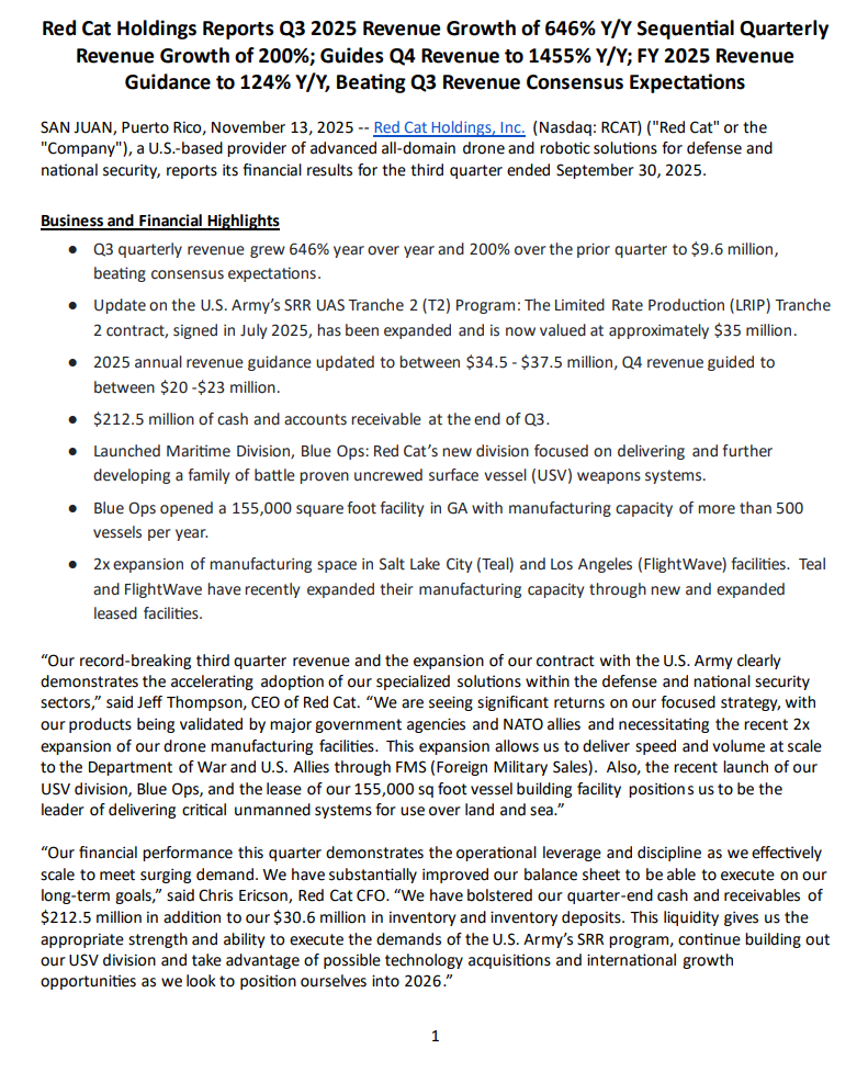 Red Catin kolmas neljännes oli poikkeuksellisen vahva. Yhtiö nosti koko vuoden näkymiään selvästi. Kasvua tulee erityisesti + tietysti puolustus- ja turvallisuussektorilta, jossa sopimukset Yhdysvaltain armeijan kanssa laajenevat ja tuotteet ovat muutenkin saaneet vahvan jalansijan myös jenkkien liittolaisiltakin. Yhtiö kasvattaa drone- ja merijärjestelmien tuotantoa vastatakseen nopeasti kasvavaan kysyntään.