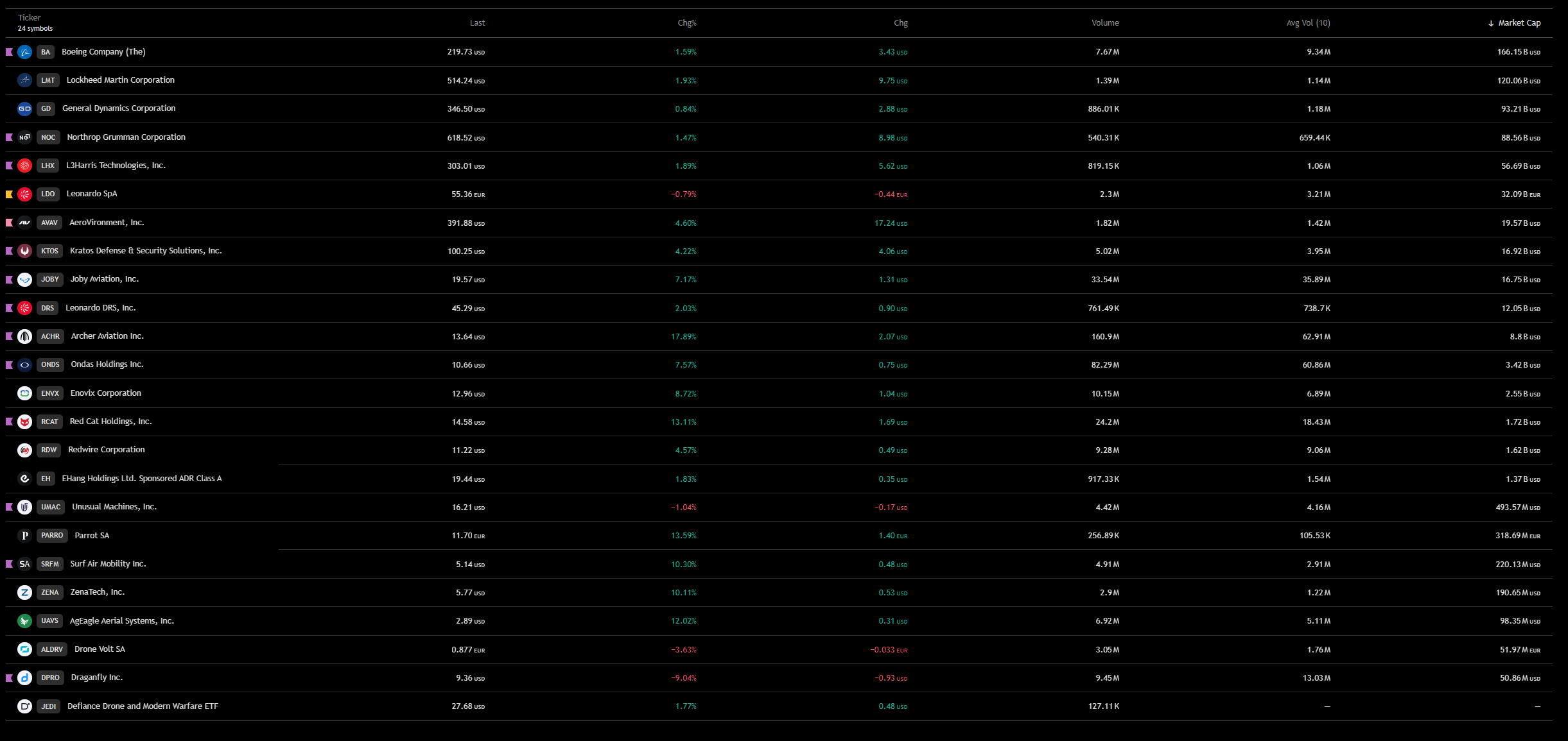 Laitetaanpa tänne oma seurantalista droonien osalta. Melko moni firma on tuttu, mutta vain pintapuolisesti. Mukana on myös isompia puolustusteknologian monialafirmoja, joilla on jotain droonien kanssa tolskaamista sivubisneksinä. Lista on market capin mukaan suodatettu: