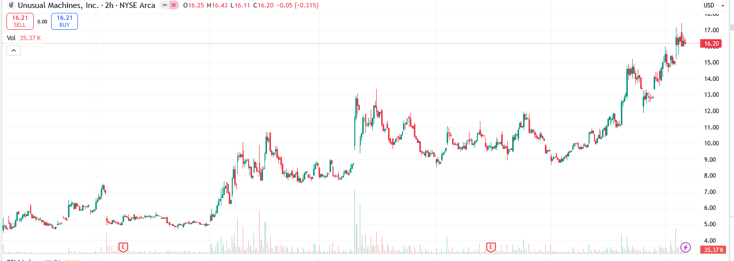 Käyrä näyttää selkeästi Bullish tai jopa ultra bullish. Yritys on tehnyt parin kuukauden sisään pari antia ja kurssi ei ole käytännössä kyykännyt juurikaan niiden takia. Lisäksi eilen ilmoitettu anti sisälsi yli 400miljoonan keräyksen tämänhetkistä kurssia arvokkaammalla 11.50$/per osake kurssin ollessa 10.50$ pinnassa. Huhuja liikkuu että yirtys ostaa muita drooniyrityksiä ja aikoo vahvaan markkinajohtopaikkaan. Konsultteja on kerätty kokeneista sotilasjohtajista ja nettisivujen mukaan ovat mukana myös Trumpin Golden Dome-projektissa. Toimitusjohtaja Eric Brook on yllättävän jalat maassa-tyyppi. Usko ainakin itsellä tähän on kova. Jotkut sanovat tätä seuraavaksi Palantiriksi.