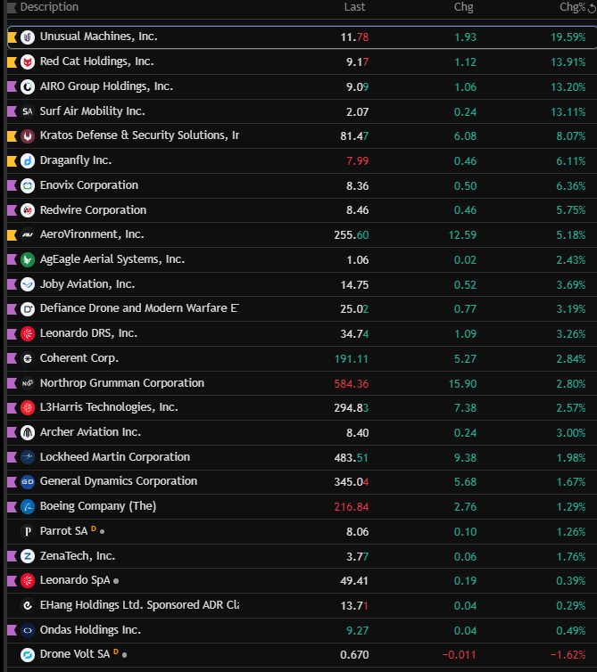 Jag är lite förvånad att jag inte hittade en tråd om drönare. Särskilt när det gäller amerikanska företag har det varit en hel del hype och aktivitet kring många drönarföretag. Flera företag som ens på något sätt snuddat vid drönare har stigit hundratals procent under sommaren och hösten. Volatiliteten har varit stor men riktningen har varit ganska tydligt uppåt.