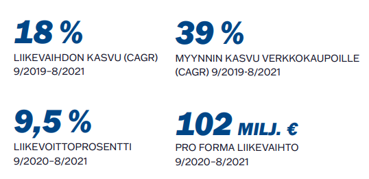 P/E on varsin suolainen 08/2021 pro forma luvuilla, mutta jos orgaaninen kasvu jatkuu, se laskee nopeasti. Annista saaduilla rahoilla maksetaan pois vvk- kirjalaina korkoineen. Tämä on varmasti järkevää, koska korko siinä on 10 %. Tämän ja IPO- kulujen jälkeen sotakassaa jää kuitenkin reilusti, joten varmasti ei mene kauaa kun uusia yritysjärjestelyitä tehdään/aletaan kartoittaa. Luotto siihen että johto osaa tämän liiketoiminnan on vahva, suurimmat riskit liittyvät nähdäkseni yrityskauppojen onnistumiseen. Kassavirran hallinta on myös kriittistä, nythän esim. 08/2021 tilikaudella varaston kasvu söi käytännössä koko operatiivisen kassavirran (tosin tämä oli tiettävästi tarkoituksellista, kun varasto kasvatettiin toimitusvaikeuksien johdosta kuluvaa tilikautta varten, kaiken järjen mukaan varastoa pitäisi vapautua kuluvalla tilikaudella siis aika mukavasti). Mutta jos esim varastonhallinta pettää tahattomasti, tai saatavien kanssa tulee ongelmia, näkyy se kassavirrassa heti. Näen kuitenkin että tässä on ainekset vahvaan, ja pääosin hallittavaan kassavirtaan.