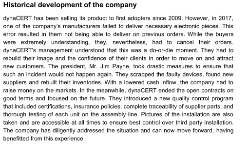 Hvis du har læst mine grove udredninger indtil nu, undrer du dig sikkert over, hvad der forårsagede kurspumpen i foråret 2017, og hvorfor den derefter faldt, for så at stige til omkring 1 CAD i 2020. Den analyse har rørt lidt ved virksomhedens historie, og her er et skærmbillede af historieafsnittet i analysen.