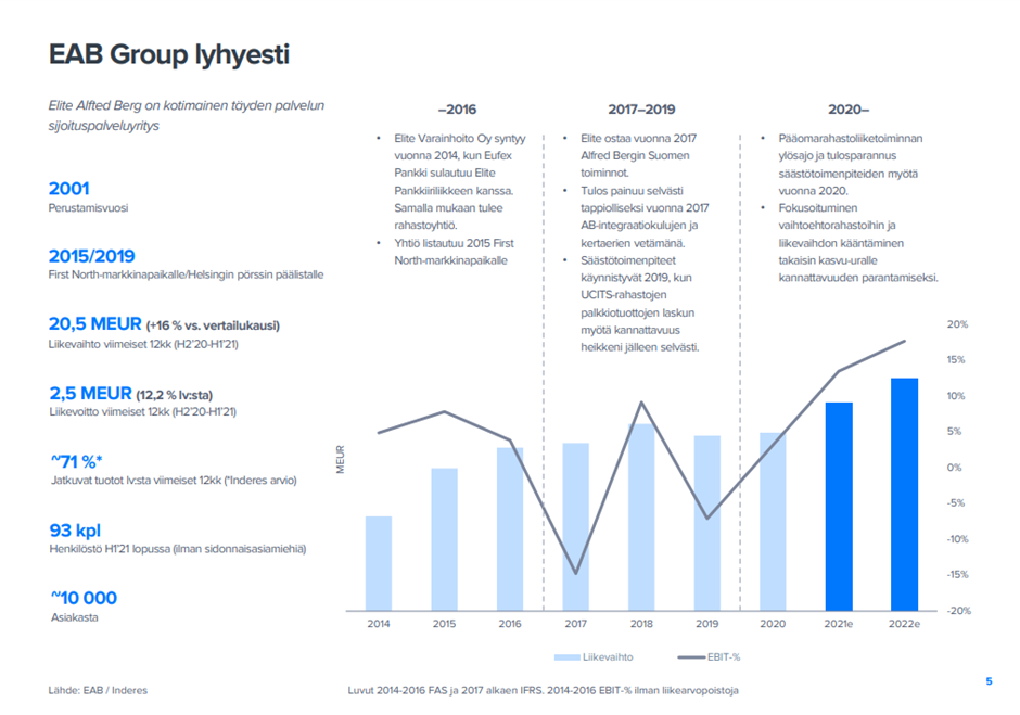 Sijoittajaprofiililtaan EAB on varsin klassinen käänneyhtiö. Yhtiön taloudellinen kehitys 2015 listautumisen jälkeen on ollut hyvin vaatimatonta ja yhtiöllä on ollut ongelmia päästä kiinni alan erittäin suotuisiin trendeihin. Keskeiset syyt ovat näkemykseni mukaan olleet strategisen fokuksen puute, tuotetarjonnan heikko kilpailukyky ja strategian toimeenpano. Numeroiden kautta tarkasteltuna yhtiön kokoluokka suhteessa sen laajaan palvelutarjontaan on ollut yksinkertaisesti liian pieni kunnolla kannattavan liiketoiminnan tekemiseen.