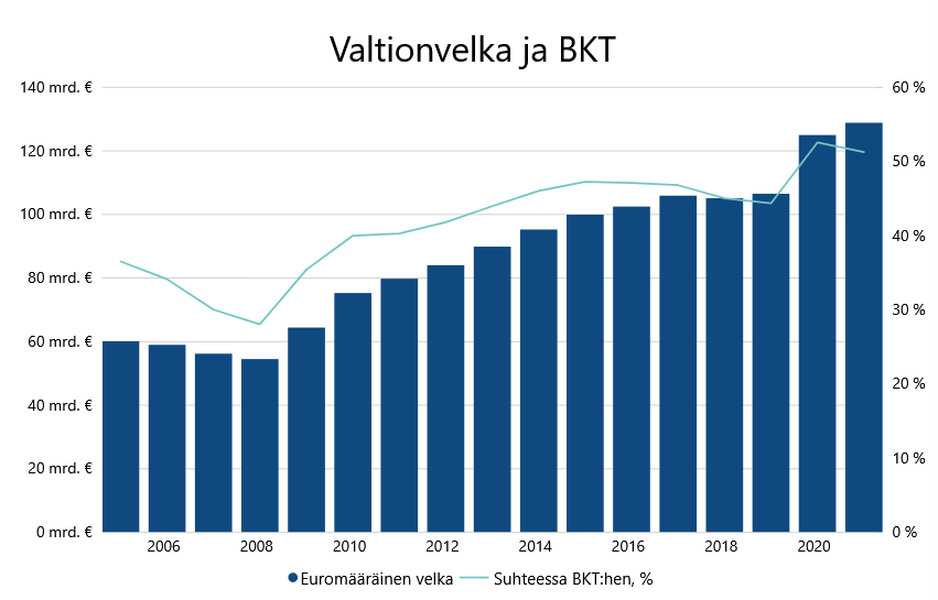 Finlands statsskuld var vid tiden för riksdagsvalet 2019 ca 103,6 miljarder euro. Sedan dess har ca 38 miljarder euro i ytterligare skuld tagits upp och skulden i förhållande till BNP är ca 50 %. Senast vi låg över 50 % i förhållande till BNP var år 1993, när Finland befann sig i sin största depression någonsin.