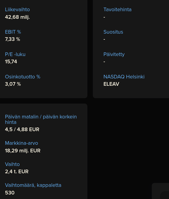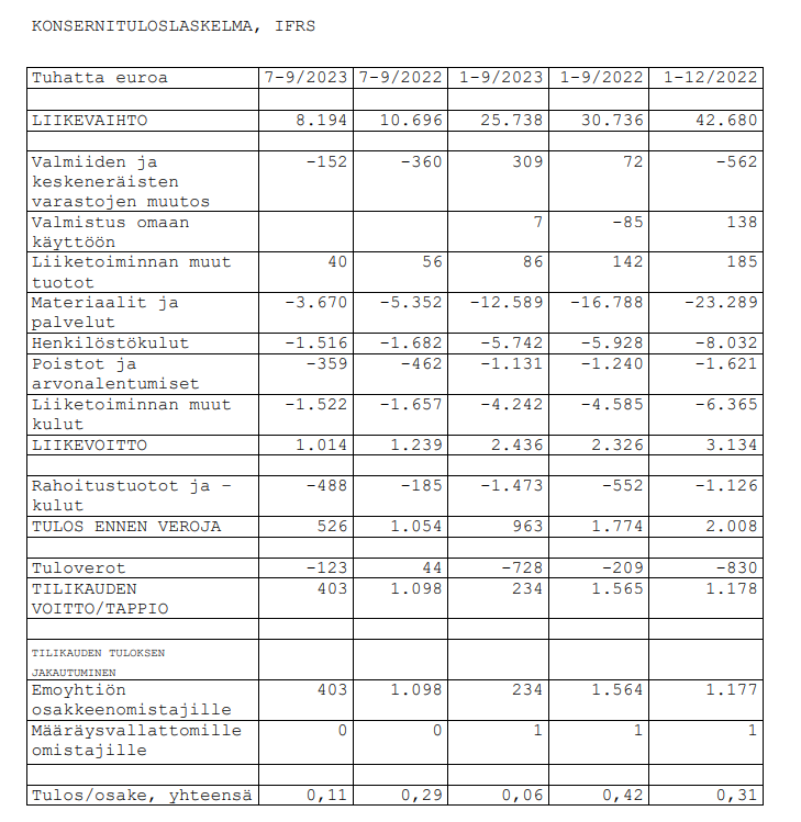 The increase in interest rates and the significant depreciation of currencies central to Elecster against the euro have substantially increased financing costs and slowed down the implementation of customer investment projects more than anticipated. Partially for the same reason, the delivery volume of packaging materials in the last quarter remained clearly below the comparison year’s level. The result is also weakened by one-off write-downs on receivables, which do not affect cash. Thus, the relative improvement in operational profitability was not fully reflected in earnings per share.