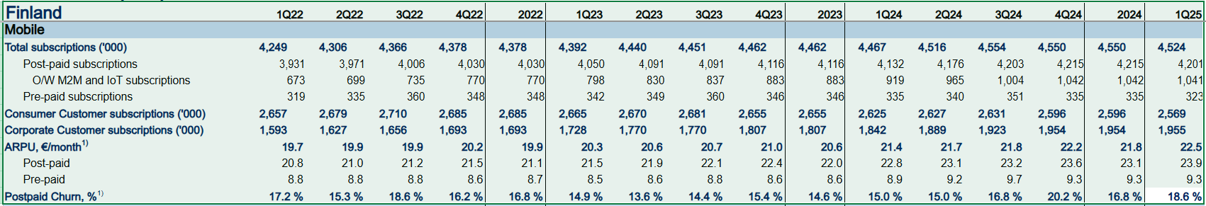 Flot ARPU-vækst i Post-paid abonnementer. (0,3 EUR pr. kvartal) —> til 23,9 EUR. Hvis antallet af abonnementer forblev det samme, ville det øge mobilserviceomsætningen med omkring 5+% på årsbasis.