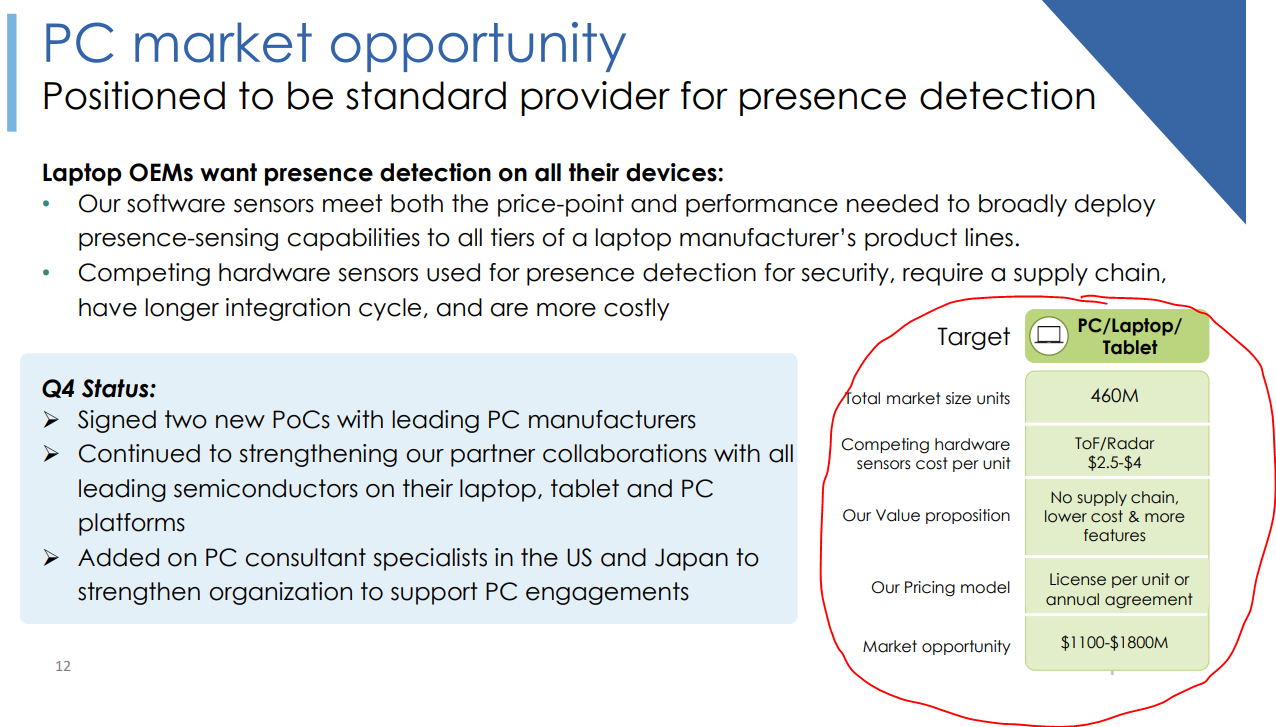 5 Proof-of-Concept-avtal, varav några med TOP-5 PC OEM:er. Jag förstod från Q4 conf. calls Q&A att detta är det enda företaget som kan erbjuda en sådan produkt för PC-sidan.