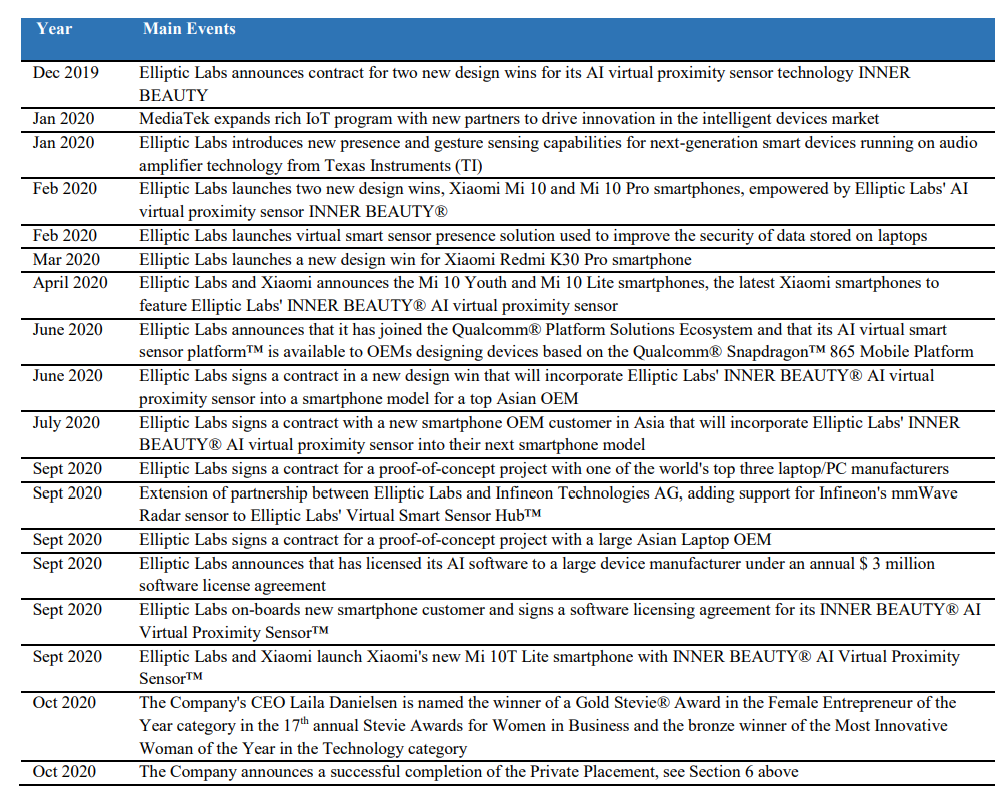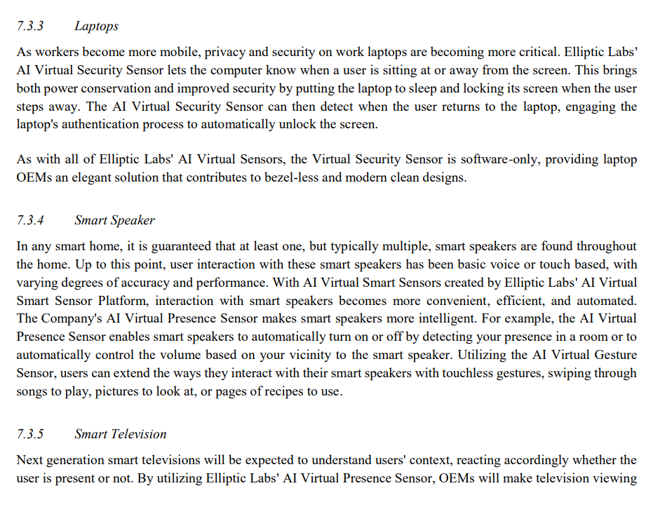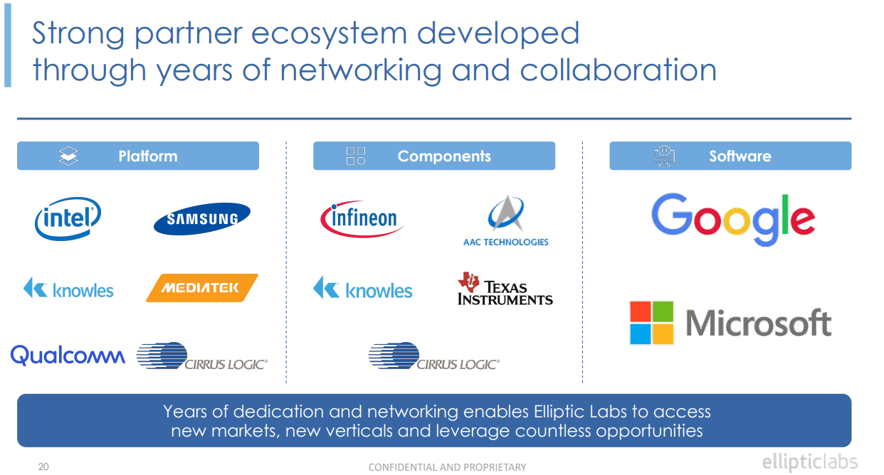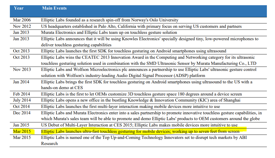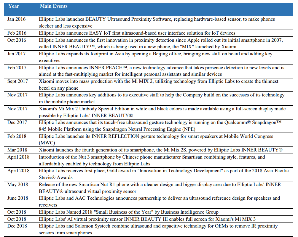 Företaget grundades 2006 som en forskningsavknoppning från Oslos universitet i Norge, och är nu ett globalt företag som riktar sig mot smartphone-, laptop-, IoT- och fordonsmarknaderna. Företagets patenterade AI-programvara kombinerar ultraljuds- och sensorfusionsalgoritmer för att leverera intuitiva 3D-gester, närhets- och närvarokänsla. Dess skalbara AI Virtual Smart Sensor Platform skapar endast mjukvarusensorer som är hållbara, miljövänliga och redan distribuerade i över 150 miljoner enheter. Elliptic Labs är det enda mjukvaruföretaget på marknaden som har levererat detektionsfunktioner med AI-programvara, ultraljud och sensorfusion i stor skala. Elliptic Labs teknik och IP är utvecklad i Norge och ägs enbart av företaget.