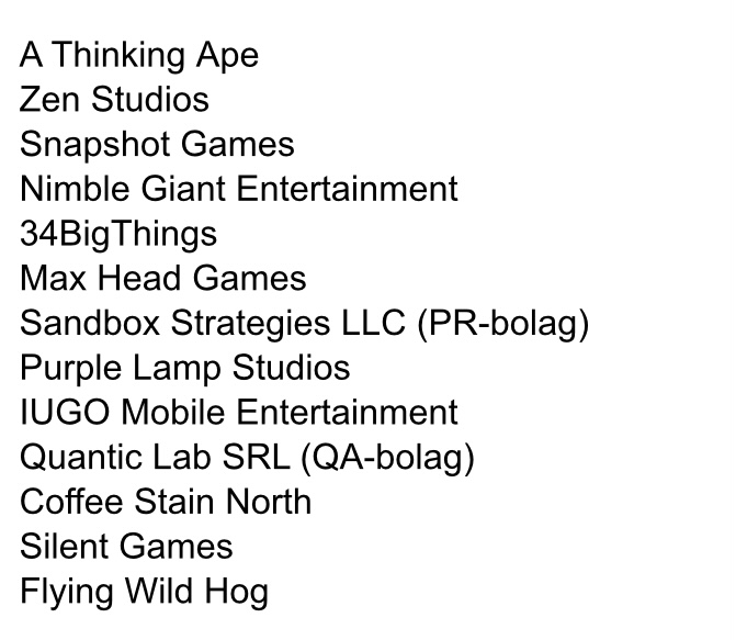 Nimblegiant ja 34bigthings näyttää tarttuneen myös haaviin. Edit. Mad head games myös lisätty listalle.