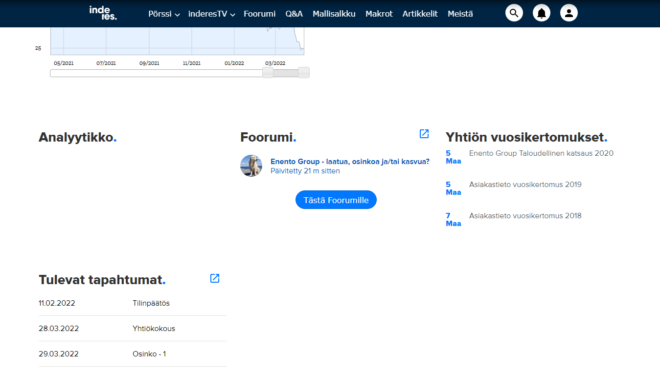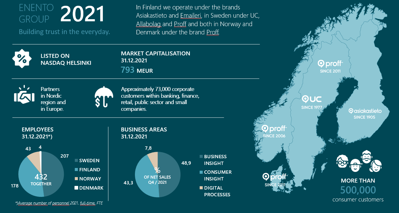 Aika luoda foorumille ketju Enento Groupista, tämä vielä puuttuu. Kyseessä on entinen Asiakastieto Oyj, joka yhdistyi 2018 ruotsalaisen UC AB:n kanssa. Suomalaiset kuluttajat tuntevat entisen Asiakastieton luottotieto-palveluista, mutta yrityksellä on myös monenlaista taloustietoihin, hinta-arvioihin ja dataan perustuvaa liiketoimintaa laajasti pohjoismaissa. Vähän optimistisella tulokulmalla tähän saa ‘bumtsibum’ meininkiä kun yrityksen ydin on laadukkaan ja monipuolisen datan keräämistä, siitä tehtyä älykästä statistiikkaa ja mallinnusta, sekä jalostettuja digitaalisia palveluita.