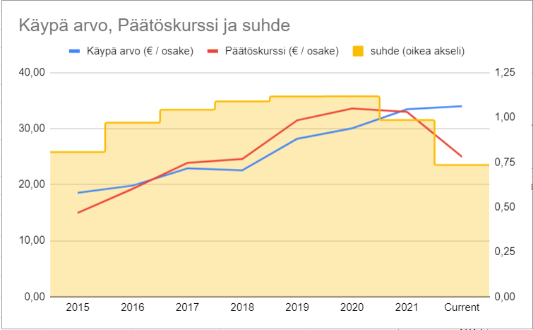 - Pessimisti: Jos vaan nykyinen 1.4€/osake rahavirta jaettaisiin ulos ja kasvu on ±0% => arvo 28€ (osinko +5%)