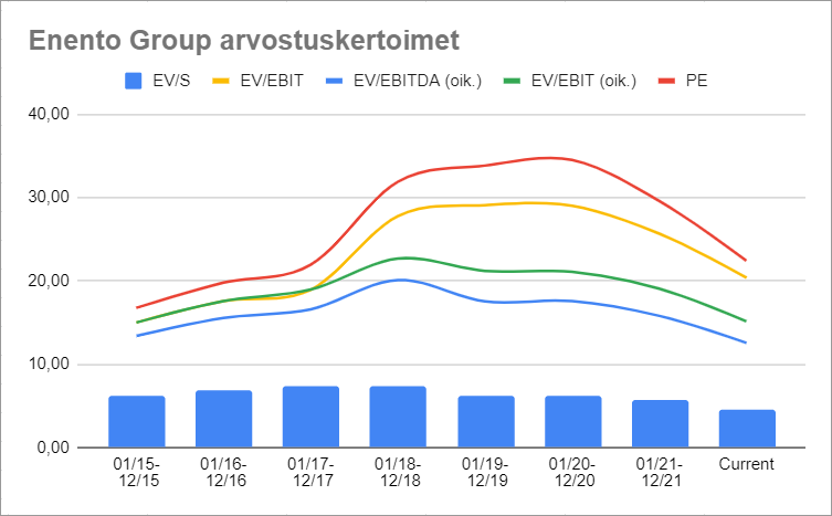| Vuosi | Liikevaihto | Käyttökate | Liiketulos | Nettotulos | Osinko | Investoinnit | Osakkeet lkm | Nettovelka | Yritysarvo^ | Osakekannan arvo | DCF osake | Päätöskurssi |