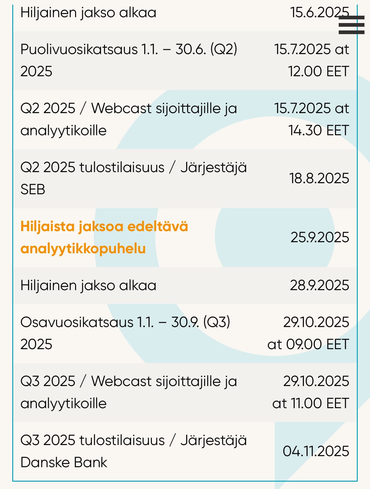 Sijoittajakalenterista. Meille on valitettavasti jäänyt sijoittajakalenteriin vanha päivämäärä (25.9), koska jouiduimme siirtämään puhelua nopealla aikataululla uuteen ajankohtaan (16.9). Eli pahoittelut siitä, että kalenteria ei oltu päivitetty - näin ei tietysti saisi käydä. Päivitämme sen asap.