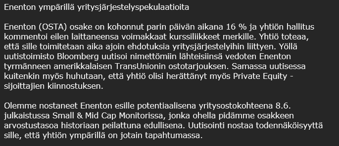 En nyt aivan ymmärrä pointtiasi. Neuvotteluja on selvästi käyty ja sanamuodot “Yhtiön hallitus harkitsee ja arvioi erilaisia vaihtoehtoja Enento Groupin ja sen osakkeenomistajien etujen turvaamiseksi” tuovat selvästi esiin, että Enenton hallitusta on tunnusteltu jollain tarjouksella, mutta se on torjuttu. Osakkeenomistajien etujen turvaaminen viittaa siihen, että tarjottu hinta on ollut selvästi alle historiallisten arvostustasojen, eikä se ole ollut osakkeenomistajien edun mukainen. Enenton omien osakkeiden osto-ohjelman voi nähdä myös eräänlaisena puolustustoimenpiteenä. Muistaakseni Nokia teki vastaavalla tavalla, kun koronadipissä yhtiön osakkeen kurssi oli jossain 2 euron kohdilla ja spekulaatiot lähtivät liikkelle. Enenton tapauksessa ei ole samanlaista perälautaa kuin Nokialle, sillä Suomen valtiolla ja eläkeyhtiöillä on se lähes 10 %:n omistus.