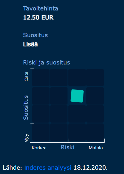 Myös osakkeen verrokkiryhmän arvostus on toisaalta noussut voimakkaasti, eikä Etteplan suhteellisesti ole aivan kohtuuttomasti hinnoiteltu. Vaikuttaisi siltä, että markkinat ovat hyvin optimistisia teollisuuden noususta koronakriisin jälkeen - osakekursseissa kulmakerroin on viritetty mahdollisesti myös jyrkämmäksi kuin analyytikoiden ennusteissa. Saa nähdä, mikä on totuus.