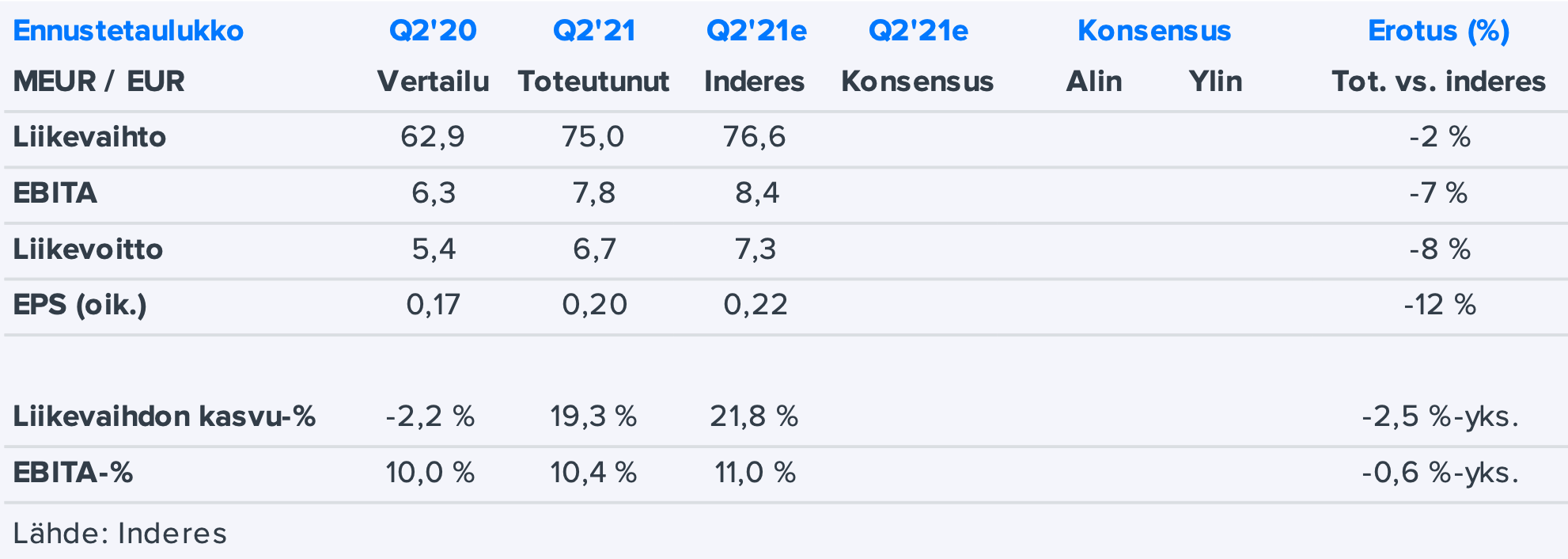 Q2 omsättning, rörelseresultat och EPS låg under Inderes mål, men Etteplan höjde sin helårsprognos för omsättningen.