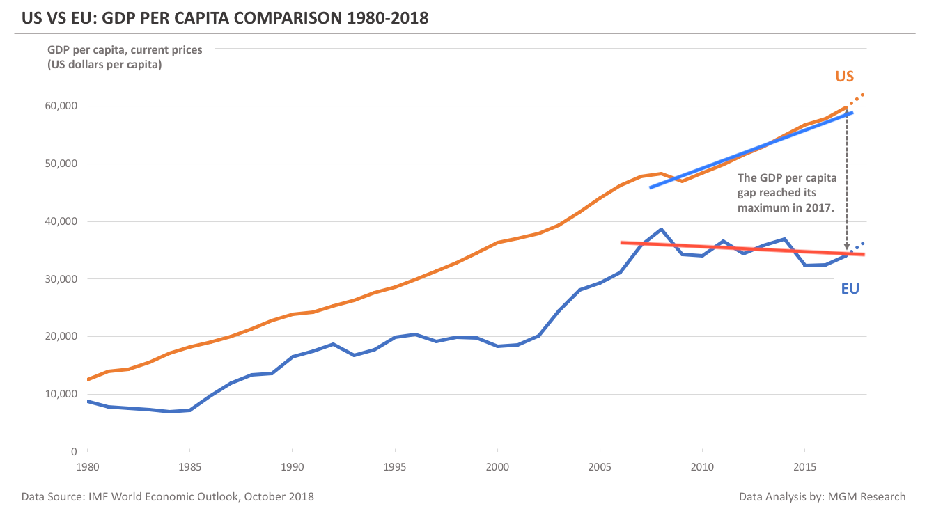 Sijoittajan näkökulmasta tilanne on hieman kimurantti. Euroopan osakemarkkinoiden tulevaisuus kun on pitkällä aikavälillä sama, kuin eurooppalaisten yhtiöiden menestyminen. Toisaalla Eurooppa ei ole pärjännyt kunnolla teknologiapuolella, toisaalla perinteisessä teollisuudessa aasialaiset ovat meitä tehokkaampia. Jotta ei menisi ihan synkistelyksi on Euroopassa toki vahvojakin aloja. Ne vaan sijaitsevat usein EU:n ulkopuolisessa Euroopassa (esim. Sveitsi ja Britannia), jolloin ne eivät voi hyödyntää EU:n muskeleita globaalissa kilpailussa kunnolla, jolloin niidenkin kilpailukyky voi olla pitkässä juoksussa verrokkimaita heikompi. Eurooppa (ja EU:kin) on väkiluvultaan suurempi kuin Yhdysvallat ja täälläkin on osaamista mutta emme ole kyenneet kanavoimaan sitä osaamista samalla tavalla.
