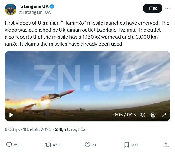 Ensimmäinen julkaistu video Ukrainan Flamingo -ohjuksen laukaisusta.