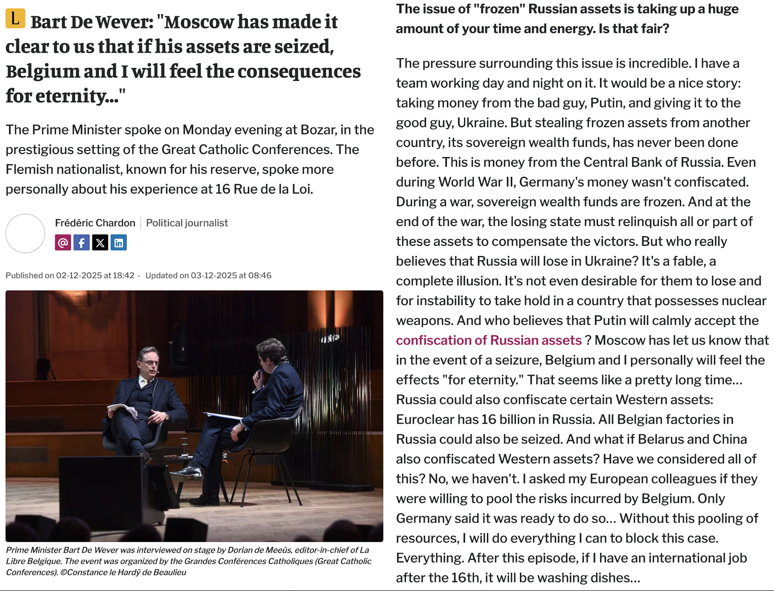 Valget burde ikke være svært. Belgien er bange og undviger derfor ansvaret for at overdrage Ruslands beslaglagte midler til Ukraine. Der burde laves en aftale, der fordeler ansvaret. Belgien bør ikke overlades alene med ansvaret, fordi Putin skræmmer. Enighed på andre måder – Europas eget lån eller overførsel af midler til Ukraine – afhænger også af Ungarn, Slovakiet og andre tøvende lande.