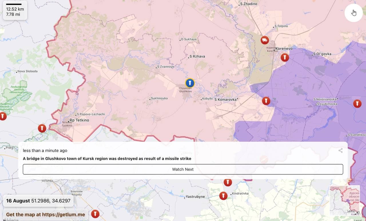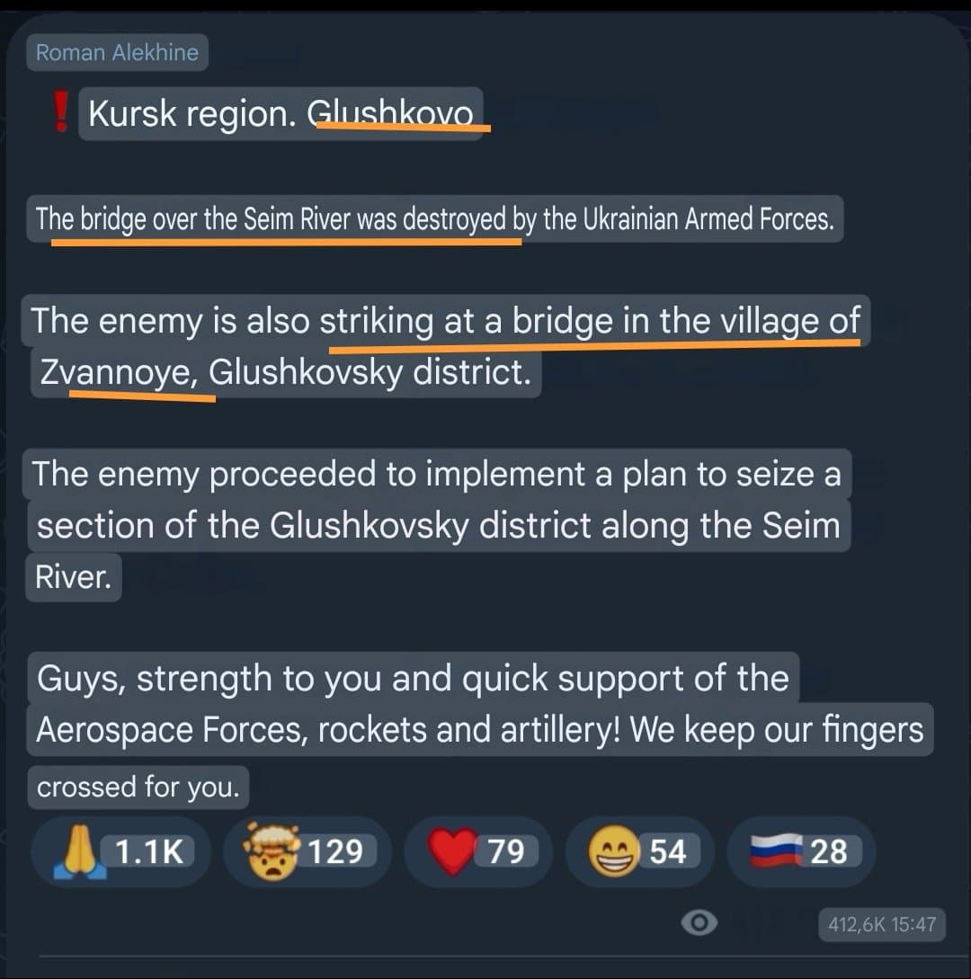 Roman Alekhin kertoo, että silta on juuri tuhoutunut ja Ukrainan vapautusjoukot toteuttavat suunnitelmaa Glushkovon alueen eristämiseksi.