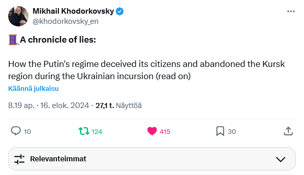 Hodorkovski vaikuttaa ainakin jonkin verran vastustavan Ukrainan sotaa, mutta ei osoita kirjoituksissaan lainkaan siympatiaa tai empatiaa Ukrainalle. Hänen painotuksensa on aina Venäjässä ja venäläisissä sekä Putinin regiimin vastustamisessa. Eipä tuollainen käyttäytyminen paranna mielikuvia venäläisestä oppositiosta ja tilanteen oleellisesta muuttumisesta paremmaksi vaikka Putler saataisiin syrjäytettyä.