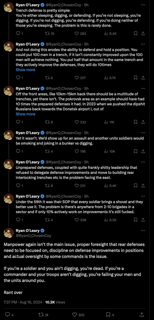 Ryan O’Leary nostaa hyvin esiin miten heikosti Ukrainan joukot ovat kaivaneet puolustusasemia ja miten tämä vaikeuttaa puolustamista nyt kun vahvimmat vuosien saatossa kaivetut puolustusasemat on menetetty ja mahdollistaa Venäjän nykyisen etenemistahdin, vaikka paperilla edellytyksiä etenemiselle ei ole.