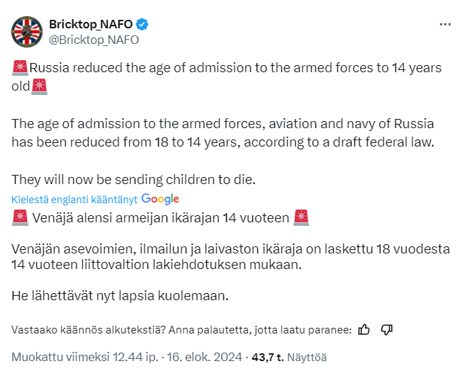 On muuten mielenkiintoista, miksi Ukraina ei maksimaalisesti hyödyntänyt Venäjän rajalinjan romahdusta Kurskin suunnalla. Oliko kyse miehistöpulasta, varovaisuudesta, vai halusta saada siviiliväestö poistumaan ensin alueelta. Ainakin sotavankien suuri määrä tuotti vaikeuksia.