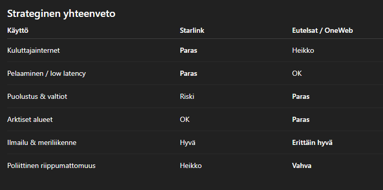 Hos Eutelsat ville de højeste download-hastigheder med en LEO-satellit (Low Earth Orbit) være omkring 150 Mbit/s og forsinkelsen på 70 ms. Eutelsats satellitterminal er betydeligt større end Starlinks, og etableringen er dyrere. Dette skyldes delvist, at Eutelsats satellitter er længere væk, hvilket kræver mere effekt fra “terminalen”. Eutelsat opererer derfor snarere gennem operatører, stater, militæret og virksomheder via mellemled. Nye satellitter vil forbedre netværket fra 2027 og frem, men jeg har endnu ikke fundet mere præcise estimater. GEO-satellitter (som er betydeligt længere væk) har en forsinkelse på 500-600 ms og en hastighed på under 100 Mbit/s.