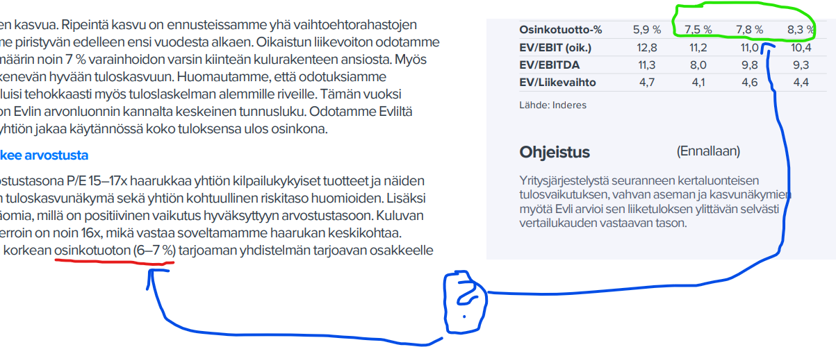 Tässä on jäänyt pieni epätarkkuus raporttiin. Tuo 6–7 % viittaa lisäosingoista oikaistuun tulokseen perustuvaan osinkotuottoon. Epävarmat lisäosingot huomioiden päästään sitten tuohon 8 %:iin.
