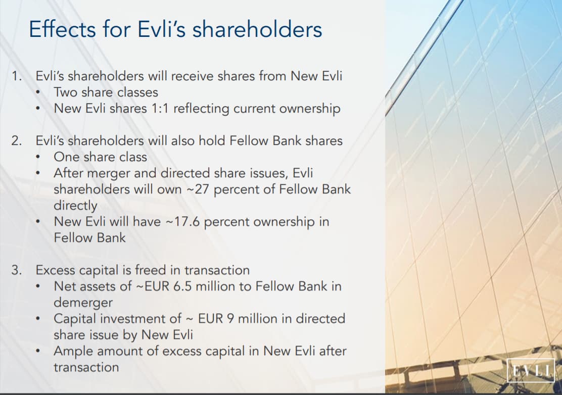 Eli EVLI jakautuu uudeksi EVLIksi ja Fellow Pankiksi ja Fellow Finance sulautuu Fellow Pankkiin, jota rahoitetaan vielä erikseen. Itselle on vähän epäselvä tapahtuuko EVLIn jakautuminen heti, vai tehdäänkö fuusio EVLIn sateenvarjon alla ja jakautuminen tapahtuu vasta vasta toteutuneen fuusion jälkeen? Ja tuleeko tosiaan EVLIn nykyisistä omistajista myös Fellow Pankin omistajia.