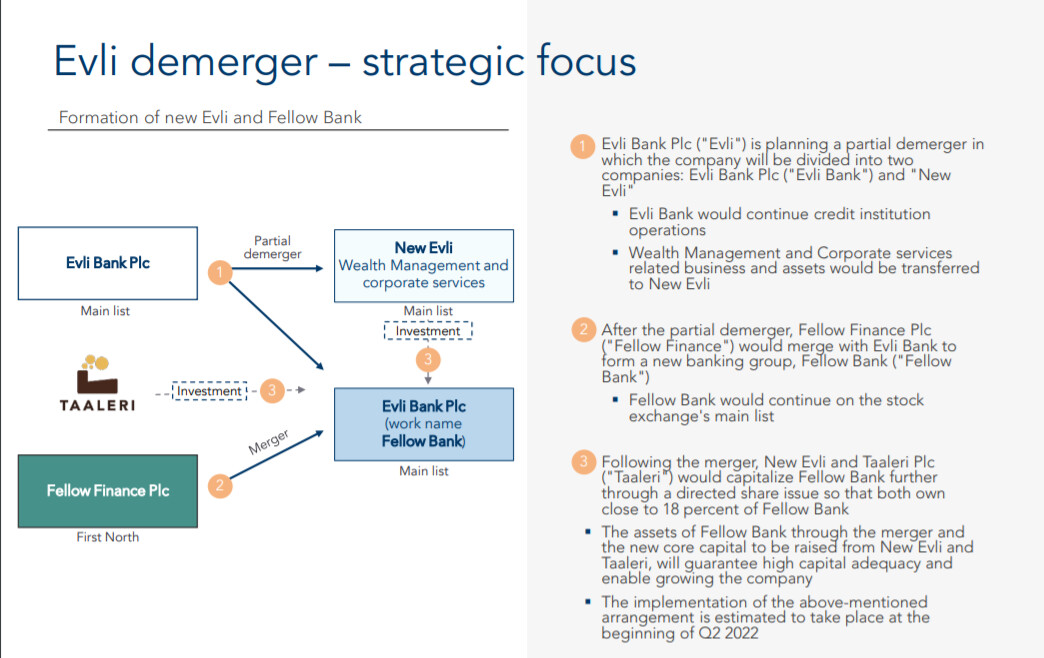 Evli Pankki Oyj (”Evli”) ja Fellow Finance Oyj (”Fellow Finance”) ovat tänään allekirjoittaneet yhdistymissopimuksen (”Yhdistymissopimus”). Yhdistymissopimuksessa sovitaan järjestelystä (”Järjestely”), jolla Evli jakautuu osittaisjakautumisen kautta uudeksi varainhoitoon keskittyväksi ja listattavaksi konserniksi (”Uusi Evli”) ja Evlin pankkitoimintaa jatkavaksi yhtiöksi, johon Fellow Finance sulautuu (Fellow Financen ja Evlin pankkitoimintaa jatkavan yhtiön sulautumisessa muodostuva yhdistynyt yhtiö jäljempänä ”Fellow Pankki”). Järjestelyn toteutuksen yhteydessä Uusi Evli, Taaleri Oyj sekä Fellow Financen toimitusjohtaja Teemu Nyholmin omistama yhtiö pääomittavat Fellow Pankkia suunnatussa osakeannissa, jolla varmistetaan selvästi viranomaisvaatimuksia korkeampi vakavaraisuus.