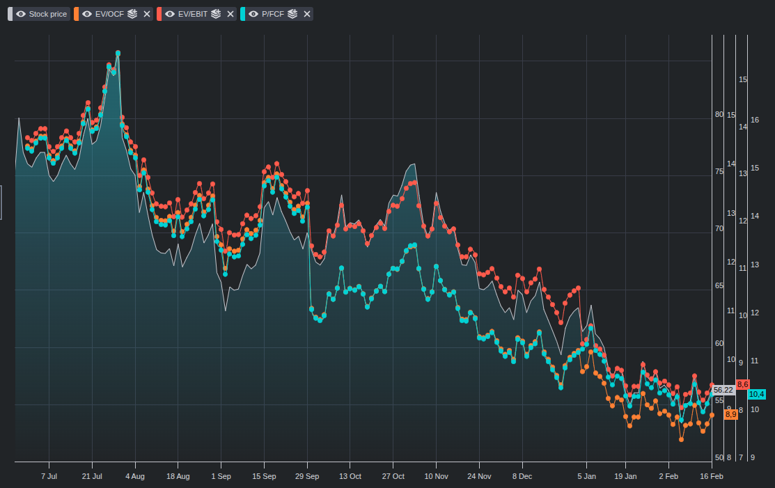Laitetaan vielä börsdatasta kuvaajia Hacksawin arvostuksesta. Jos EV/EBIT ~ 8-9 sekä P/FCF ~ 10, ja kasvetaan +20% vuodessa, niin vaikea nähdä kurssin laskevan tästä enää hirveästi