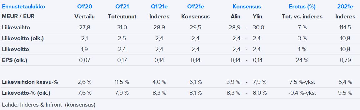 Yllättävän kevyt reaktio kurssissa, jos liikevaihto kasvaa mutta liiketulos laskee, eihän se ole kannattavaa liiketoimintaa? Tässä mennään nyt ihan yhtiön johdon lupausten varassa liiketuloksen kasvusta. Inderesin ennuste liikevoitosta olikin sitten tällä kertaa väärä ja konsensus oikeassa…